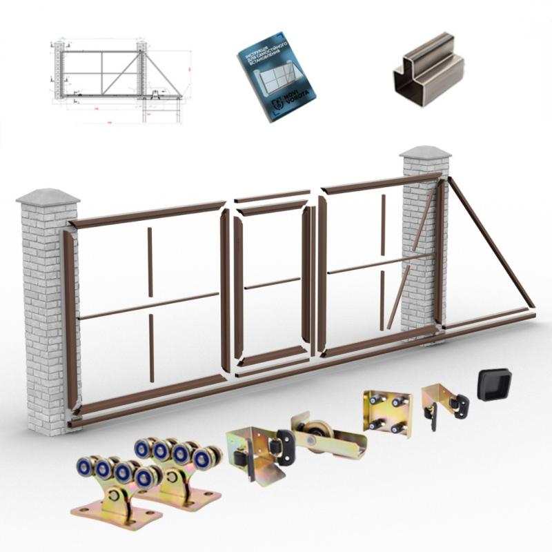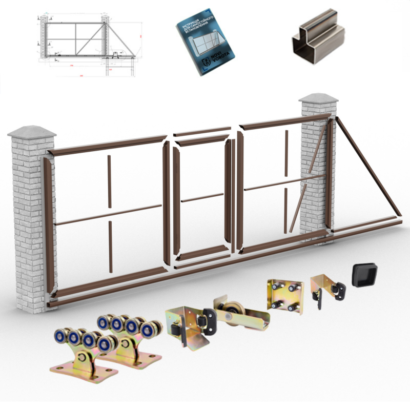 Комплект «Звари Сам» — це готовий набір металевих елементів, розрахований на самостійне виготовлення відкатних воріт з вбудованою хвірткою без необхідності звертатися до профільного виробництва. Усі деталі нарізані в розмір, підготовлені до зварювання та укомплектовані фурнітурою. Власнику залишається лише зібрати конструкцію за схемою та виконати зварні шви.